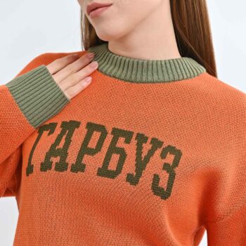 Светр містить натуральну бавовну, тому з часом можливе скочування — його легко прибрати машинкою для видалення ковтунців. Щоб уникнути зношення, не рекомендуємо носити його під верхнім одягом із грубими підкладками, блискавками або жорсткими елементами.