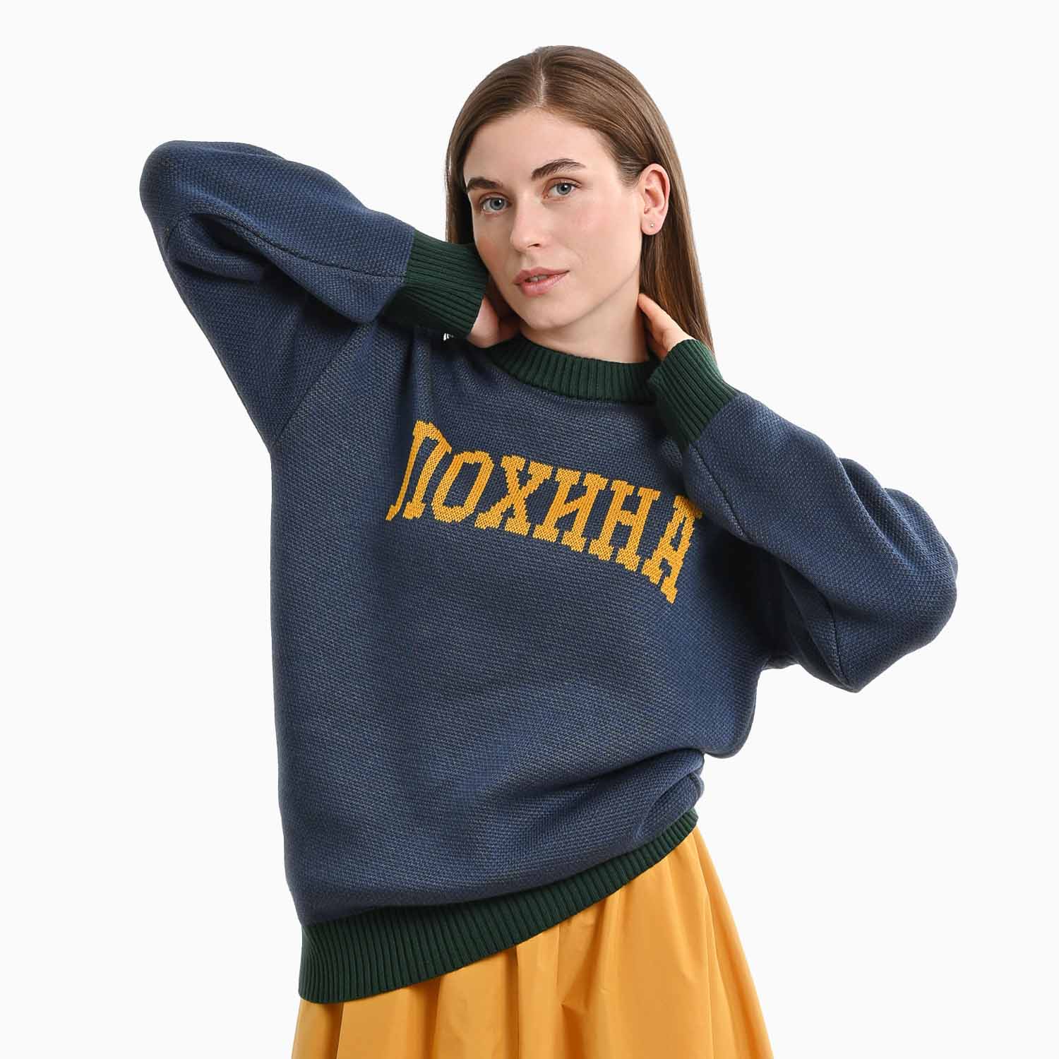Светр містить натуральну бавовну, тому з часом можливе скочування — його легко прибрати машинкою для видалення ковтунців. Щоб уникнути зношення, не рекомендуємо носити його під верхнім одягом із грубими підкладками, блискавками або жорсткими елементами.