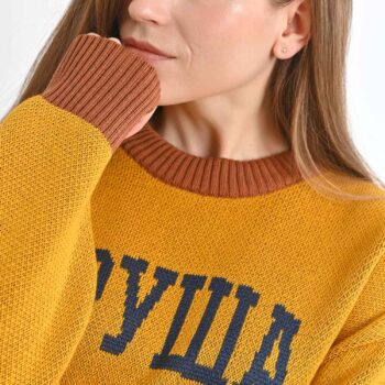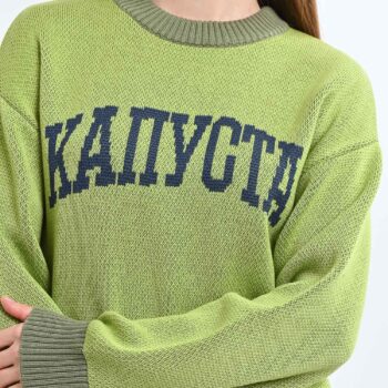 Светр містить натуральну бавовну, тому з часом можливе скочування — його легко прибрати машинкою для видалення ковтунців. Щоб уникнути зношення, не рекомендуємо носити його під верхнім одягом із грубими підкладками, блискавками або жорсткими елементами.